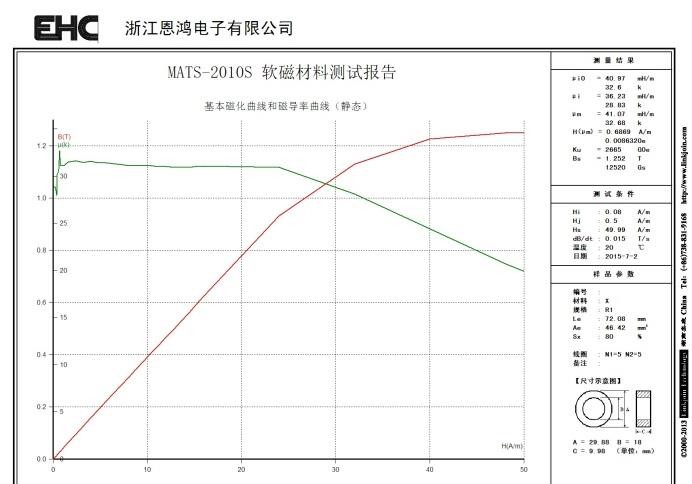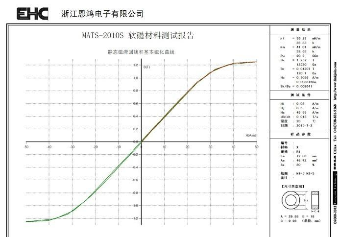 | Maksimal permeabilitet μm | Metningsmagnetisering Bs (T) | Tvangskraft Hc (Er) | Remanent Br (T) | Tap(20k,0,5T) Ps m/Kg |